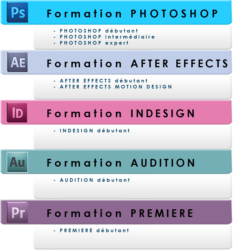 Je propose une gamme complète de formations Adobe centrées sur le Multimédia, adaptée à vos besoins et à vos intérêts. Que vous souhaitiez apprendre à utiliser les bases de l’un de ces logiciels ou même entièrement le maîtriser, je vous aiderai à trouver la formation correspondant à vos besoins et répondant à vos ambitions.